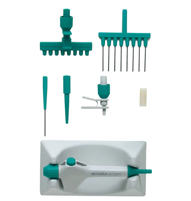 Le Vacuboy complet comprend : la poignée Vacuboy, un support pour poignée, un adaptateur pipette Pasteur, un adaptateur monocanal acier inox 40 mm, un adaptateur 8 canaux acier inox 40 mm, un adaptateur monocanal éjection automatique pour cône de micropipette, un adaptateur monocanal en plastique pour cône de micropipette, un adaptateur 8 canaux éjection automatique pour cône de micropipette.