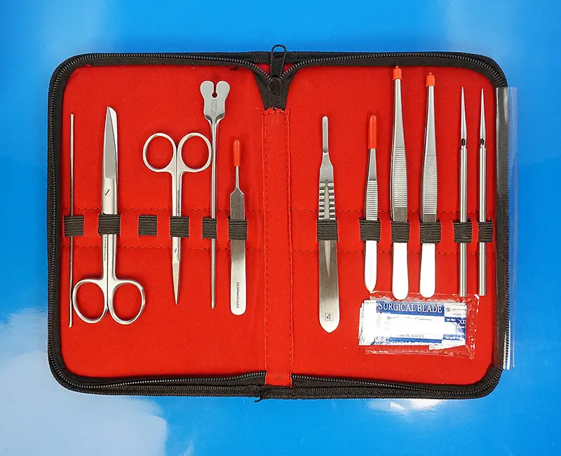 Set of stainless steel dissection instruments (EC marking) contained in a case with a velvet interior and zip closing.