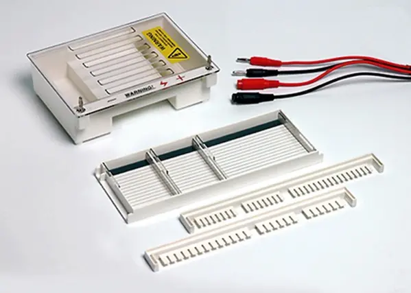 La cuve est livrée avec : • cuve et couvercle, • 1 préparateur de gels, • 1 plateau 105 x 83 mm, • 2 plateaux de 50 x 83 mm, • 2 peignes doubles : 8/8/17 et 12/12/25 dents, 6/6/12 et Mark1/Prep1/23 dents, • cordons.