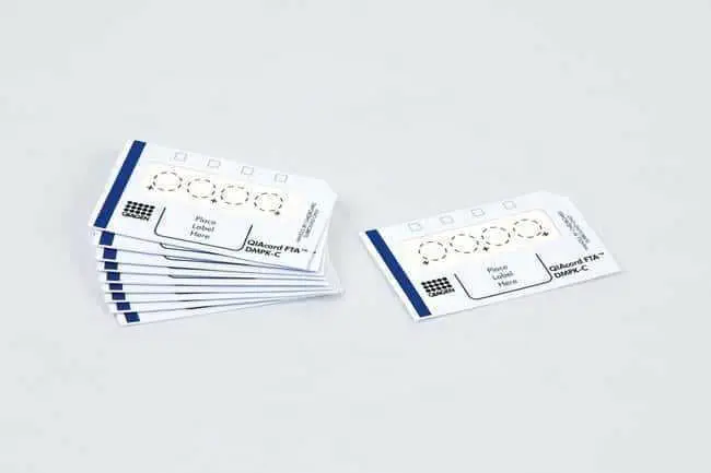 Qiacard FTA est une carte imprégnée d'une chimie brevetée : lorsqu'un échantillon biologique est déposé sur le FTA, cette chimie lyse les cellules et dénature les protéines, tandis que les acides nucléiques sont extraits et protégés dans les fibres du papier. La carte FTA se transporte à température ambiante jusqu'au laboratoire ou se stocke à température ambiante en vue d'une analyse ultérieure.