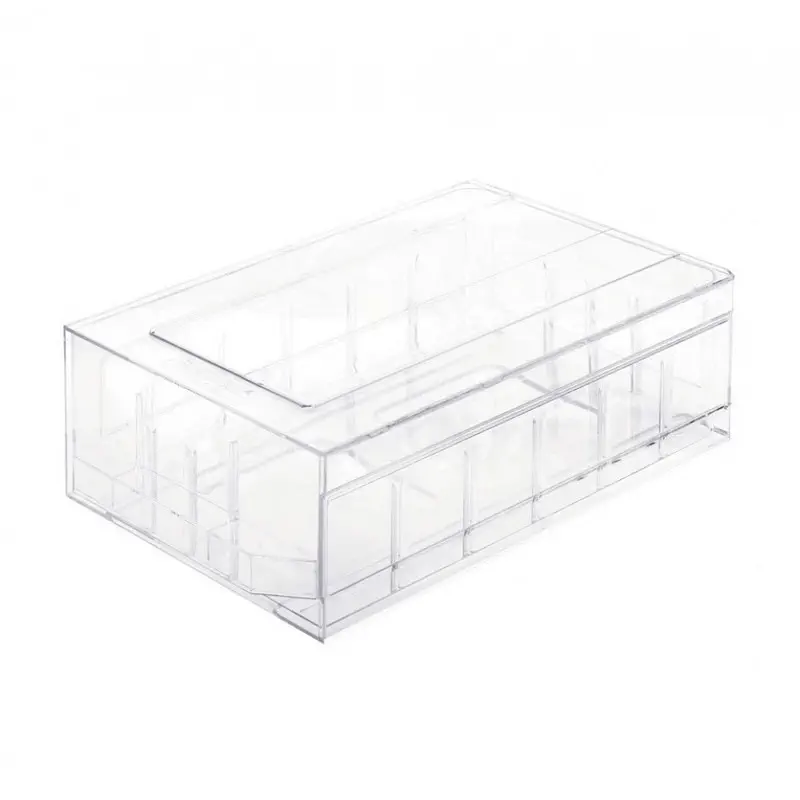 Boîte transparente en polystyrène, idéale pour le rangement modulaire au laboratoire. Le choix des dimensions et de la configuration des séparateurs offre une variété infinie de combinaisons de rangement.