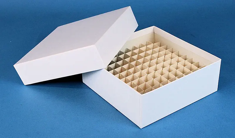 Boîte en carton hydrophobe pour le rangement de cryotubes et microtubes de diamètre 12 mm. Les croisillons sont pré-montés dans les boîtes.