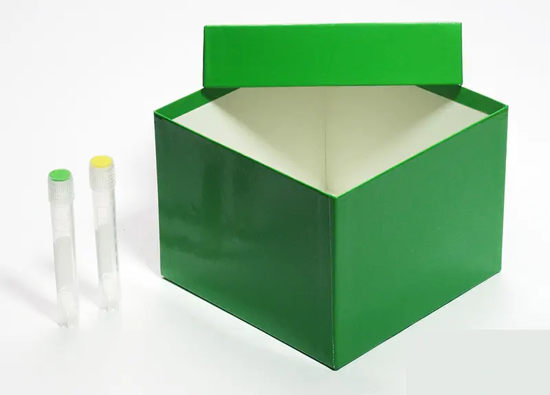 039517 · Boîte de congélation en carton plastifié couleur verte pour cryotubes 5 ml
