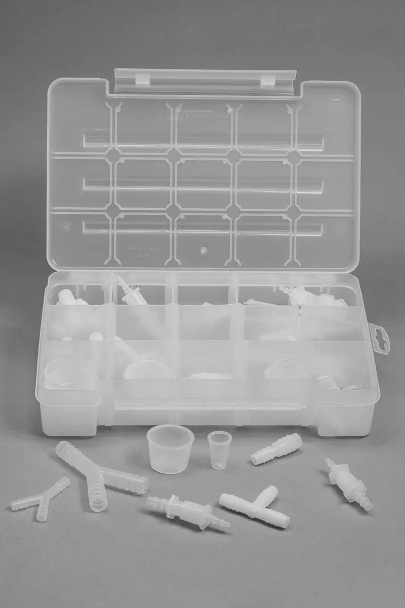 Assortiment de 76 raccords en polypropylène autoclavable de tous types, rangés dans une boîte en polystyrène transparent. Comprend :
