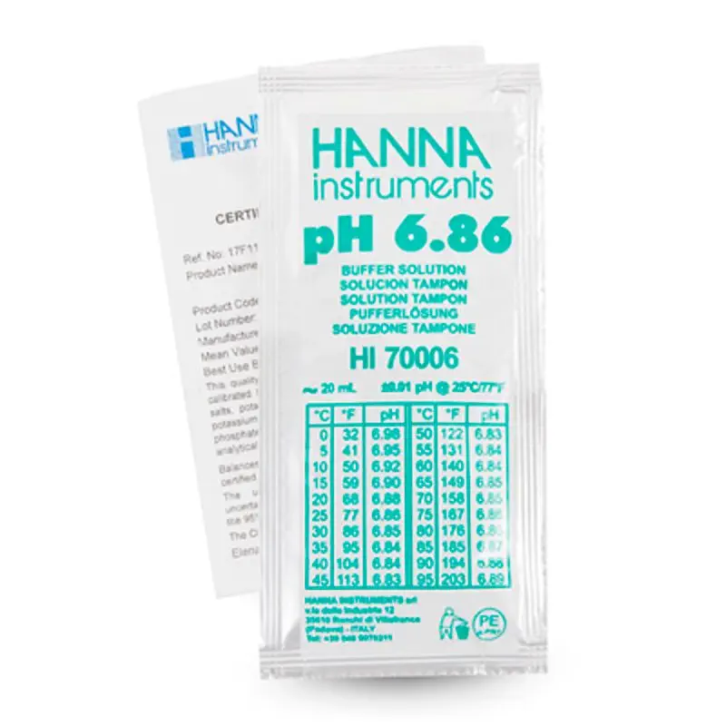 Les solutions tampons HANNA Instruments sont fabriquées avec des matériaux de référence certifiés NIST et standardisées avec un pH-mètre étalonné selon un standard primaire également rattaché à la norme NIST.