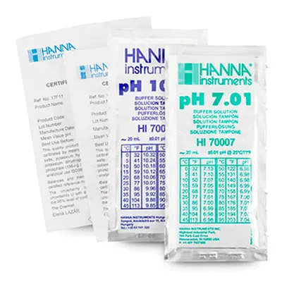 Les solutions tampons HANNA Instruments sont fabriquées avec des matériaux de référence certifiés NIST et standardisées avec un pH-mètre étalonné selon un standard primaire également rattaché à la norme NIST.