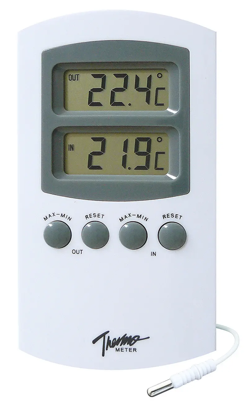 Thermomètre double affichage intérieur/extérieur avec mémoire maxi et mini. Fonction hygromètre en sus pour la référence 098510 : 3 affichages (température extérieure, température intérieure et hygrométrie).