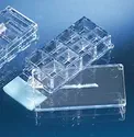 Chambre de culture LAB-TEK I sur lamelle, non séparable, à 1, 2, 4 ou 8 compartiments fixés sur une lamelle en verre borosilicaté 25 x 56 mm. La finesse et la fragilité de la lamelle ne permettent pas de détacher la chambre. Elle comporte un couvercle amovible et est stérilisée aux rayons gamma. Les chambres sont présentées sur un plateau que l'on peut conserver dans l'incubateur. Intérêt : la lamelle en verre borosilicaté facilite les observations au microscope inversé.
