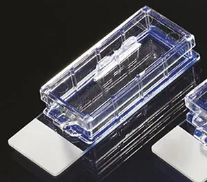 Chambre de culture LAB-TEK II sur lamelle, non séparable, à 1, 2, 4 ou 8 compartiments fixés sur une lamelle en verre borosilicaté 25 x 56 mm. La finesse et la fragilité de la lamelle ne permettent pas de détacher la chambre. Elle comporte un couvercle amovible et est stérilisée aux rayons gamma. Les chambres sont présentées sur un plateau que l'on peut conserver dans l'incubateur. Intérêt : la lamelle en verre borosilicaté facilite les observations au microscope inversé.