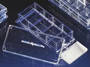 Chambre de culture LAB-TEK II sur lamelle, non séparable, à 1, 2, 4 ou 8 compartiments fixés sur une lamelle en verre borosilicaté 25 x 56 mm. La finesse et la fragilité de la lamelle ne permettent pas de détacher la chambre. Elle comporte un couvercle amovible et est stérilisée aux rayons gamma. Les chambres sont présentées sur un plateau que l'on peut conserver dans l'incubateur. Intérêt : la lamelle en verre borosilicaté facilite les observations au microscope inversé.