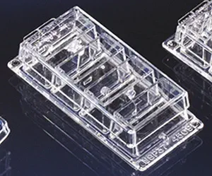 Chambre de culture LAB-TEK II sur lamelle, non séparable, à 1, 2, 4 ou 8 compartiments fixés sur une lamelle en verre borosilicaté 25 x 56 mm. La finesse et la fragilité de la lamelle ne permettent pas de détacher la chambre. Elle comporte un couvercle amovible et est stérilisée aux rayons gamma. Les chambres sont présentées sur un plateau que l'on peut conserver dans l'incubateur. Intérêt : la lamelle en verre borosilicaté facilite les observations au microscope inversé.