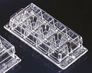 Chambre de culture LAB-TEK II sur lamelle, non séparable, à 1, 2, 4 ou 8 compartiments fixés sur une lamelle en verre borosilicaté 25 x 56 mm. La finesse et la fragilité de la lamelle ne permettent pas de détacher la chambre. Elle comporte un couvercle amovible et est stérilisée aux rayons gamma. Les chambres sont présentées sur un plateau que l'on peut conserver dans l'incubateur. Intérêt : la lamelle en verre borosilicaté facilite les observations au microscope inversé.