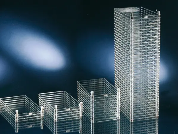 Unité de culture cellulaire intensive constituée de plateaux superposés en polystyrène transparent traité pour la culture. La répartition du milieu s'effectue par deux canaux qui assurent la liaison entre les chambres de culture. Les Cell Factories se déclinent en plusieurs modèles de 1 à 41 plateaux. Aucun équipement spécifique n'est requis. A l'échelle industrielle, il existe toutefois des systèmes robotisés effectuant la manipulation de manière automatisée. Nous consulter.