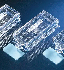 Chambre de culture LAB-TEK II sur lamelle, non séparable, à 1, 2, 4 ou 8 compartiments fixés sur une lamelle en verre borosilicaté 25 x 56 mm. La finesse et la fragilité de la lamelle ne permettent pas de détacher la chambre. Elle comporte un couvercle amovible et est stérilisée aux rayons gamma. Les chambres sont présentées sur un plateau que l'on peut conserver dans l'incubateur. Intérêt : la lamelle en verre borosilicaté facilite les observations au microscope inversé.