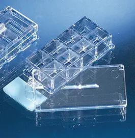 Chambre de culture LAB-TEK II sur lamelle, non séparable, à 1, 2, 4 ou 8 compartiments fixés sur une lamelle en verre borosilicaté 25 x 56 mm. La finesse et la fragilité de la lamelle ne permettent pas de détacher la chambre. Elle comporte un couvercle amovible et est stérilisée aux rayons gamma. Les chambres sont présentées sur un plateau que l'on peut conserver dans l'incubateur. Intérêt : la lamelle en verre borosilicaté facilite les observations au microscope inversé.
