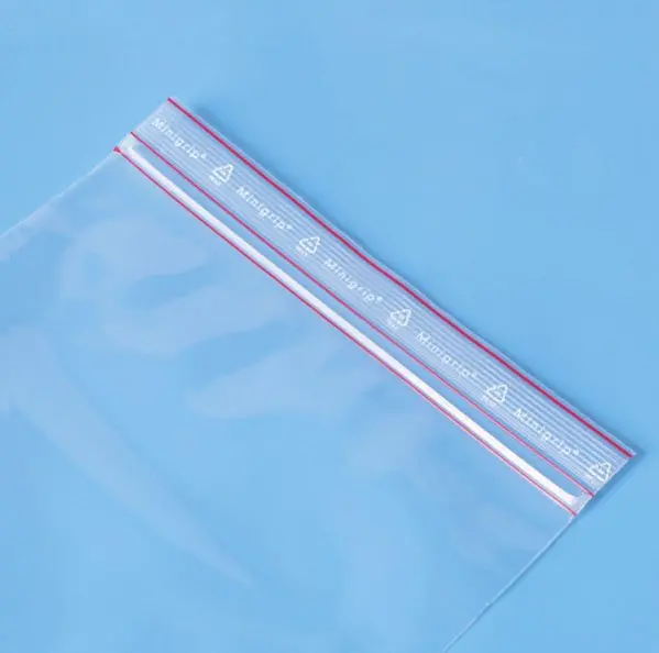 Sachets en polyéthylène avec liseré rouge sur la fermeture à glissière.