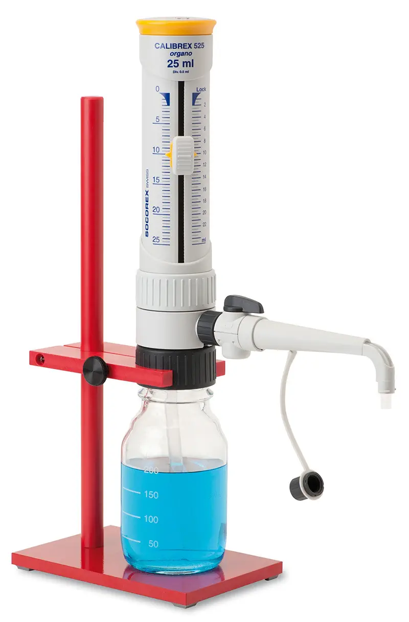 3 modèles dans une plage de volumes de 0,25 à 10 ml. L'instrument peut être vissé directement sur des flacons de laboratoire grâce à son filetage standard de 32 mm et à ses 3 adaptateurs (28, 40, 45 mm).