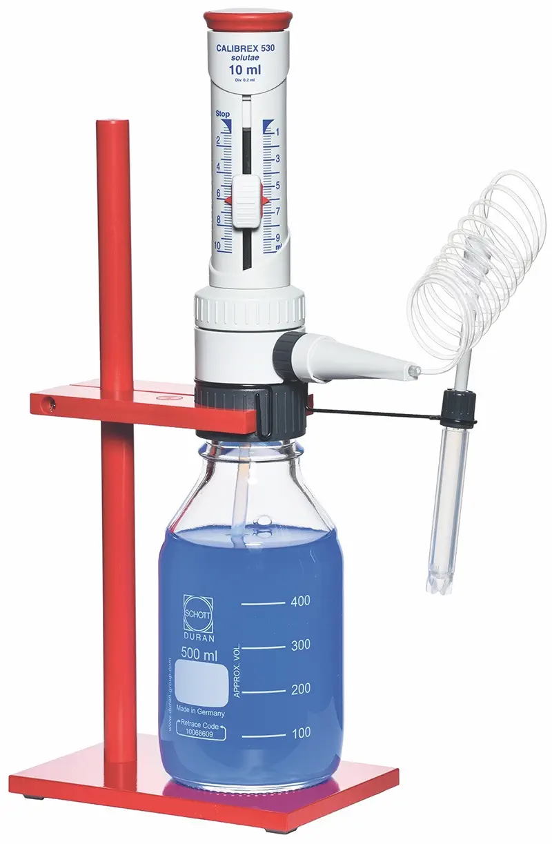 Cylindre en verre borosilicaté, piston avec couche PFA. Adapté aux solutions salines, acides forts et faibles ainsi qu'aux bases. Coloris rouge.