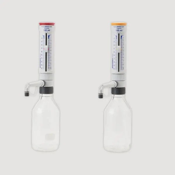 Piston en verre dépoli, cylindre en verre borosilicaté. Adapté aux solutions organiques, aux acides qui ne cristallisent pas et aux solutions basiques. Coloris jaune.