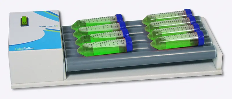 Agitateurs pour tubes à mouvements simultanés : rotation des rouleaux et oscillation de la plate-forme.