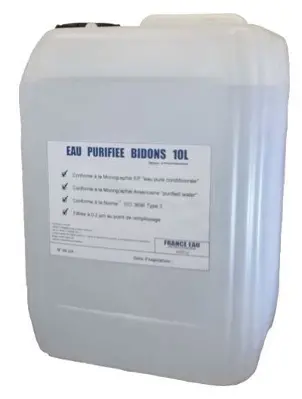 • Apyrogène • Eau purifiée, osmosée, déminéralisée • Résistivité > 0,5 MΩ. cm • Conforme à la Pharmacopée Européenne en vigueur - Monographie Eau purifiée conditionnée en récipient • Conforme à la Pharmacopée Américaine en vigueur - Monographie «Purified water» • Conforme à la Norme NF ISO3696 type 3 • Qualité bactériologique < 10UFC/100 ml • Bulletin d'analyse sur demande • Applications :rinçage du médico- chirurgical lors des protocoles de désinfection ne nécessitant pas d'eau stérile, rinçage final des instruments de laboratoire, nettoyage en salle blanche, préparation des solutions pour automate, réalisation de solutions tampon