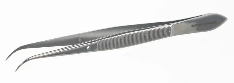 076126 · Pince Brucelles haute qualité longueur 105 mm bouts pointus courbes avec broche de guidage