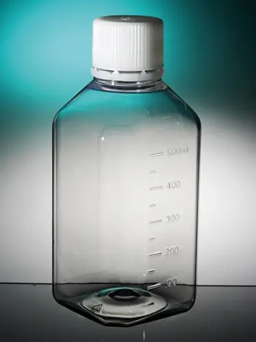Flacons avec bouchons montés. Bouchon complètement vissé, témoin d'intégrité avant ouverture. Flacons stérilisés par irradiation, SAL 10⁻³ .