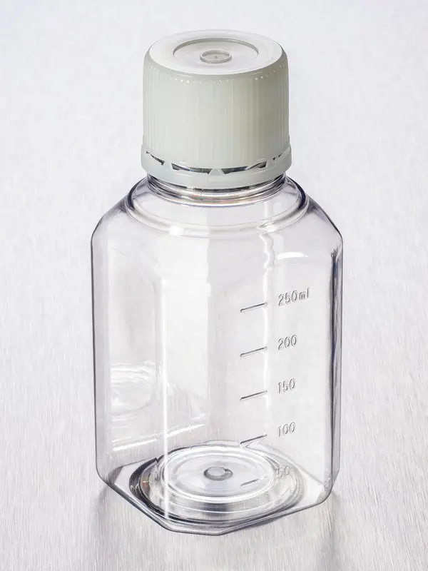 Flacons avec bouchons montés. Bouchon complètement vissé, témoin d'intégrité avant ouverture. Flacons stérilisés par irradiation, SAL 10⁻³ .