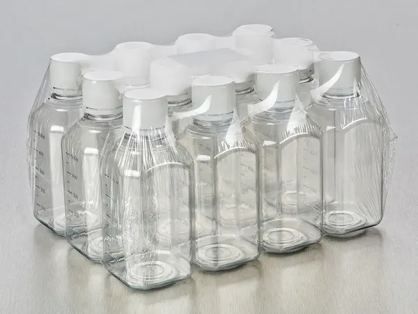 Flacons avec bouchons montés. Bouchon complètement vissé, témoin d'intégrité avant ouverture. Flacons stérilisés par irradiation, SAL 10⁻³ .