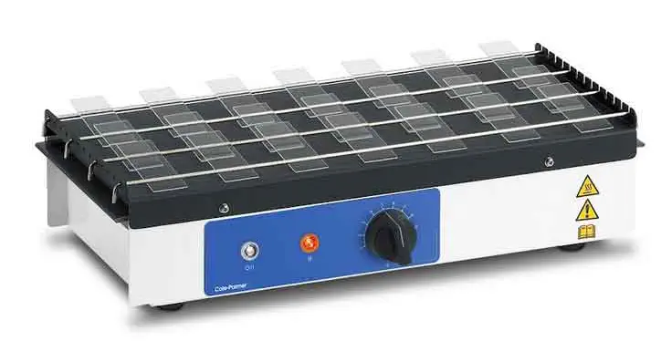 • Capacity: 50 slides • Black anodised aluminium work surface with strong contrast for better sample viewing • Easy to replace heating element • With detachable bar for positioning flat, straddled or 1 side on the bar
