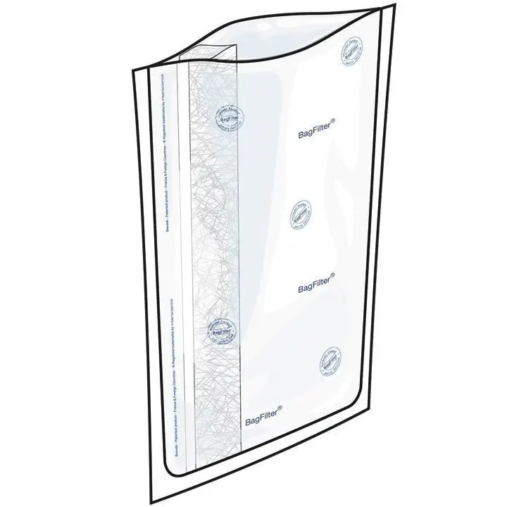 Ces sachets sont équipés d'un filtre latéral permettant de recueillir la solution à analyser débarrassée des fibres, soit par pipetage à l'aide de la BagPipet® et des pipettes paille, soit par simple versement. Ces sachets sont préconisés pour l'analyse des produits carnés et de la charcuterie.
