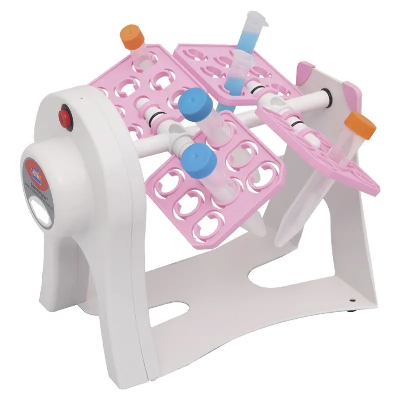 • Révolution de 360°, angle ajustable de 0 - 90° • Vitesse : 18 rpm • Pour tubes de 0,5 à 50 ml, portoirs de tubes interchangeables • Changement de la direction de rotation d'un simple geste • Garantie : 2 ans • Livrés avec 2 portoirs de chaque taille