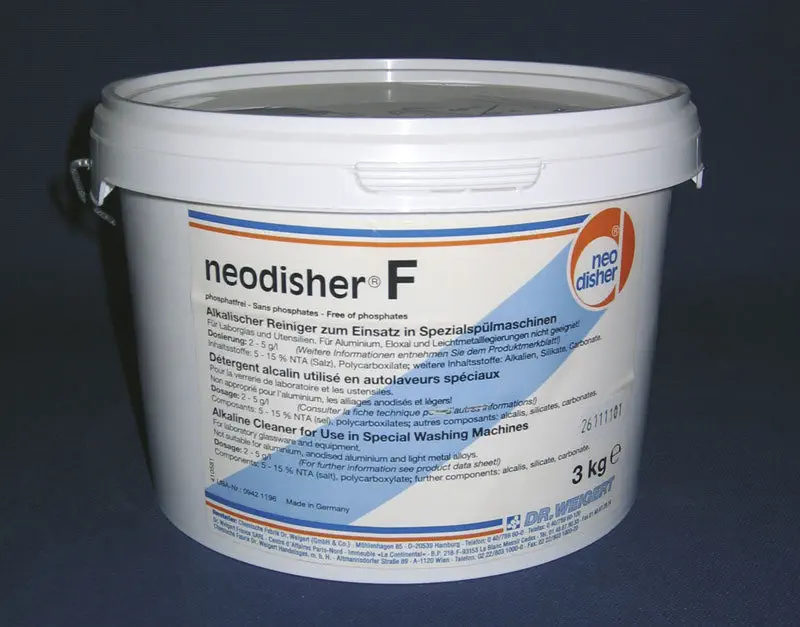 Caractéristiques détergents alcalins en poudre : • Neodisher A8 : détergent alcalin intensif à pouvoir nettoyant élevé pour la verrerie de laboratoire • Neodisher F : détergent intensif à pouvoir nettoyant élevé, bonne efficacité complexante et dispersante, sans phosphates, sans tensioactifs • Neodisher GK : détergent faiblement alcalin à action désinfectante spécialement pour des objets en verre avec des culturescellulaires et tissulaires, sans tensioactifs • Neodisher LA : détergent intensif à forte efficacité émulsionnante, dispersante et non moussant, particulièrement approprié pour l'élimination de graisses, huiles et paraffines