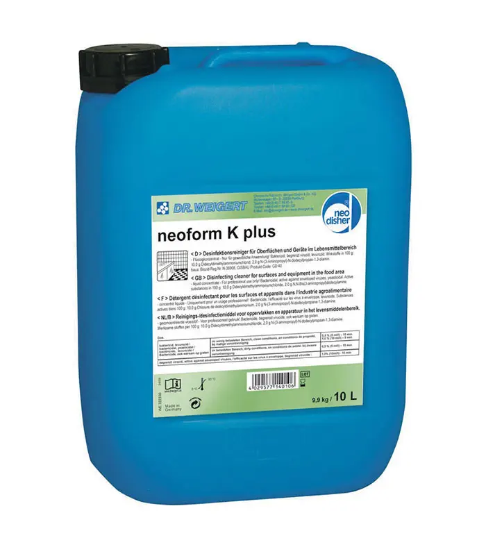 Caractéristiques désinfectant pour surfaces alimantaires : • Neoform K Plus : désinfection terminale après la phase de rinçage ou nettoyage et désinfection en une seule opération.