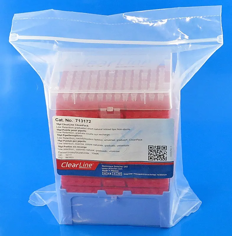 257537 · Recharge pointes ClearLine® Prime faible rétention 10 µl graduée longueur : 31,24 mm - coloris : Rouge - sachet Cleanpack