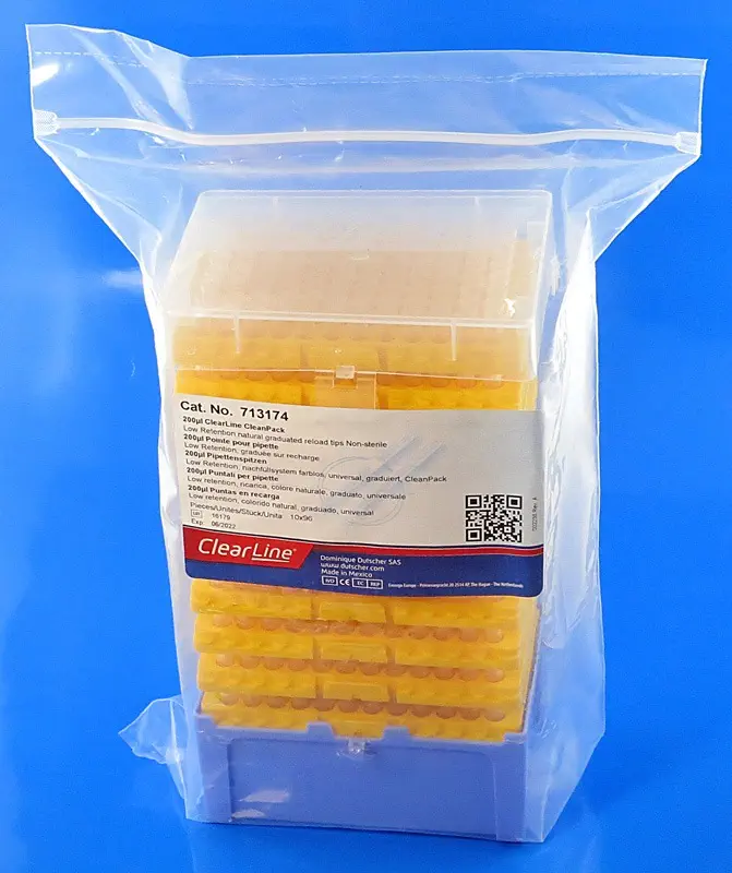 257539 · ClearLine® refill low retention tips 200 µl graduated length: 50.75 mm - colours: Yellow - Cleanpack bag