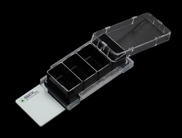 • Chambres de culture à 1, 2, 4, ou 8 compartiments fixées sur une lame (démontable) avec couvercle