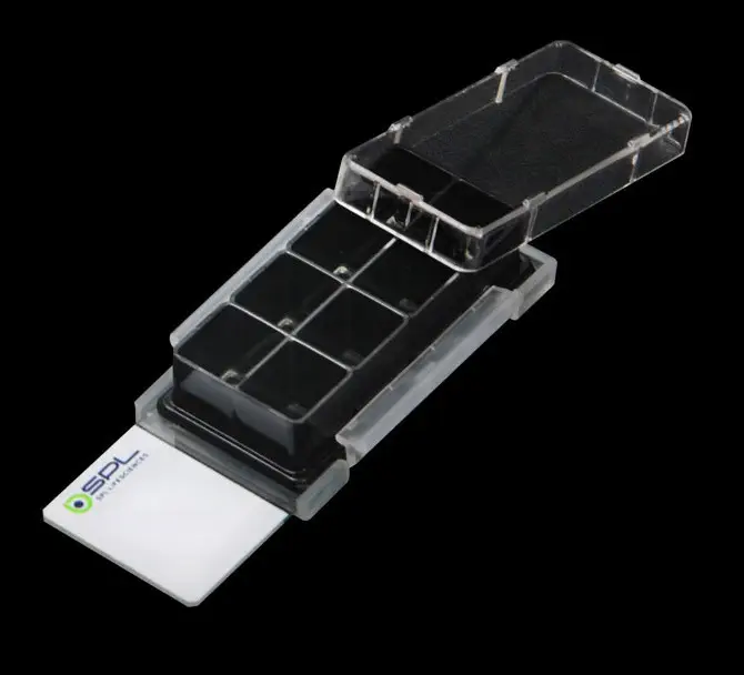• Chambres de culture à 1, 2, 4, ou 8 compartiments fixées sur une lame (démontable) avec couvercle