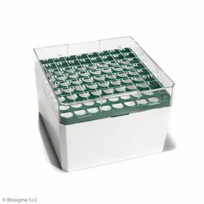 390493 · Biosigma polycarbonate CryoGen® Box -132 x 132 x 52 mm - for 100 cryotubes 1.2 and 2 ml - Green