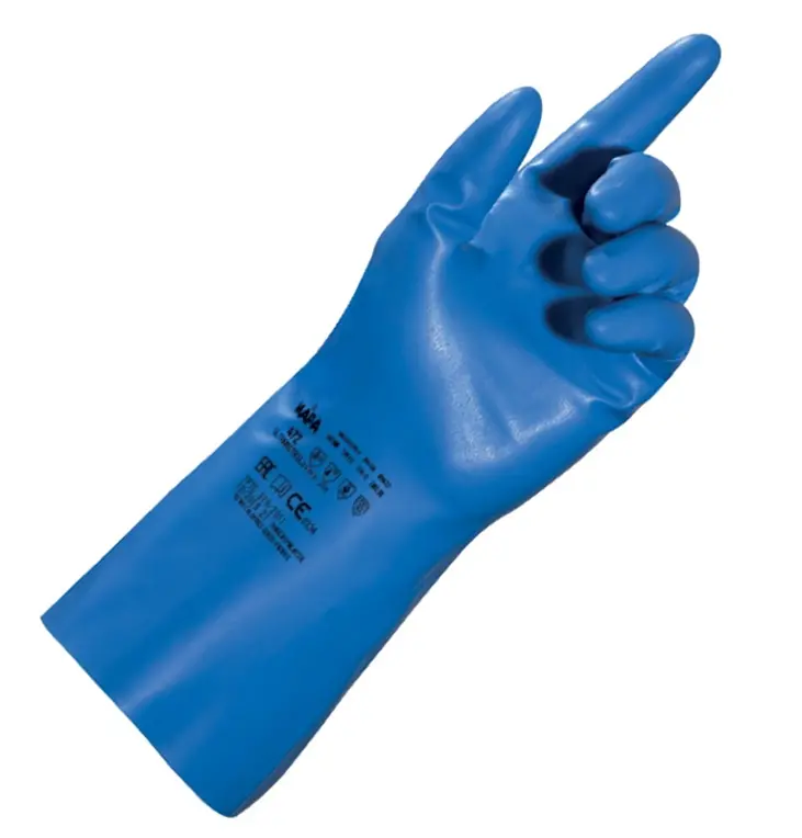 • Nitrile gloves suitable for food contact • Wear alone or over gloves • Length: 310mm, straight cuff • 0.2mm thickness: excellent sensitivity • Finitrion granite exterior • PPE Cat. III • EN 374-1: Type B chemical protection (JOT) • EN 374-5 : biological protection against micro-organisms • EN 388: 2101X • Packaging: in bags of 10 pairs