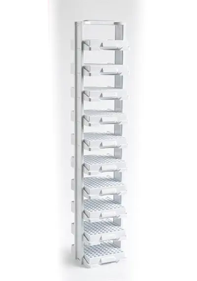 Polycarbonate storage system for freezer boxes, available with 5, 8 or 10 shelves or with platform only to be assembled. For tubes of 12 mm in diameter, maximum height 55 mm and for microtubes of 1.5 ml and cryotubes.