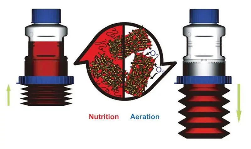 • Système aération/nutrition grâce à un mouvement décompression/compression du soufflet retenant le milieu de culture
