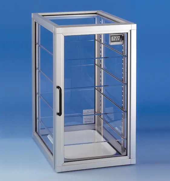 • En acrylique transparent, permettant une bonne observation • Châssis renforcé d'aluminium anodisé • Joint d'étanchéité en caoutchouc synthétique • Avec dessicant, emballé dans un sachet pratique • Serrure magnétique aisée à manier • Avec hygromètre de précision électronique à la porte qui montre les valeurs maximales et minimales de température et humidité • Peut contenir jusqu'à 26 étagères • Avec 1 plateau pour le dessicant et 4 étagères ajustables • 4 pieds anti-dérapants en caoutchouc