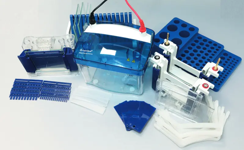 • Fourni avec tout le nécessaire pour la préparation et la migration de 1 à 4 gels de 10 x 8 x 0,1 cm 10 ou 15 puits