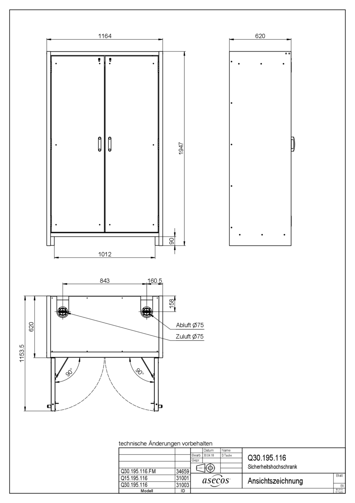DimensionsDim. ext. (l x p x h) : 1164 x 620 x 1947 mm / Dim. int. (l x p x h) : 1050 x 519 x 1626 mm