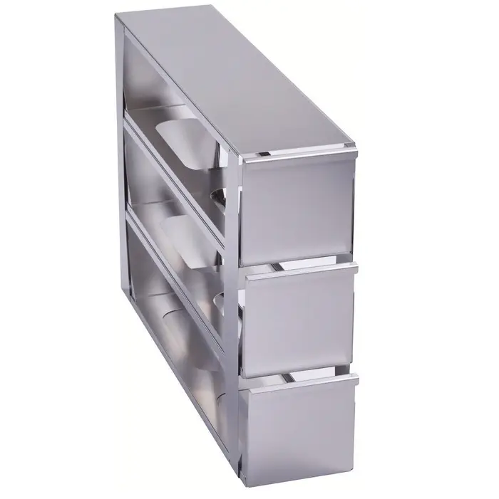 6001072510 · Freezer Rack: CryoCube® F740. 3-compartment, drawer, stainless steel - Dim. D x W x H (mm): 563 x 140 x 414 - for 12 boxes127 mm