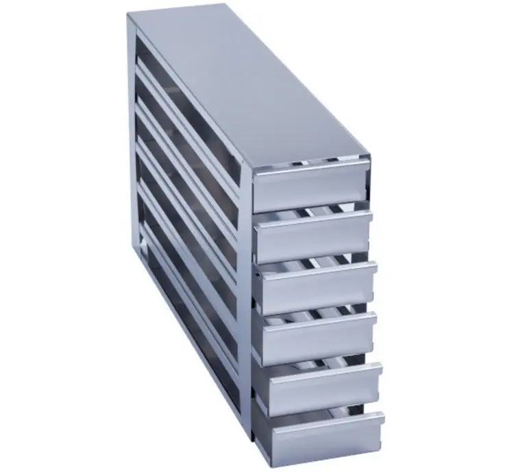 6001082210 · Freezer Rack: CryoCube® F740. 5-compartment, (MAX for 5th comp) drawer, stainless steel - Dim. D x W x H (mm): 563 x 140 x 346 - for 24 boxes 53 mm