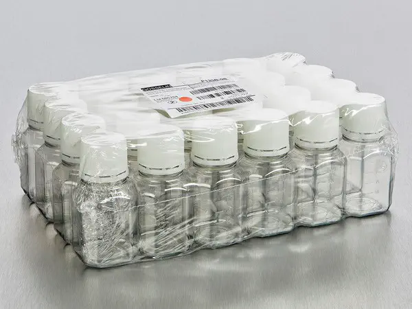 Flacons avec bouchons montés. Bouchon complètement vissé, témoin d'intégrité avant ouverture. Flacons stérilisés par irradiation, SAL 10⁻³ .