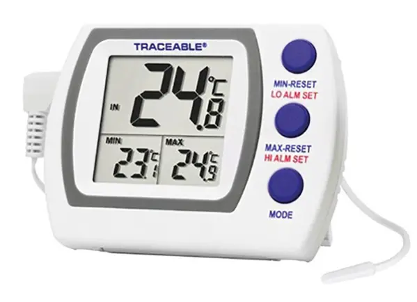 • Triple display: Min / Max and temperature • Alarm programmable in 1 °C steps • For water bath, refrigerator, freezer • 3 types of probes: bare, in glycol vial, in vaccine vial • Delivered with Traceable certificate®