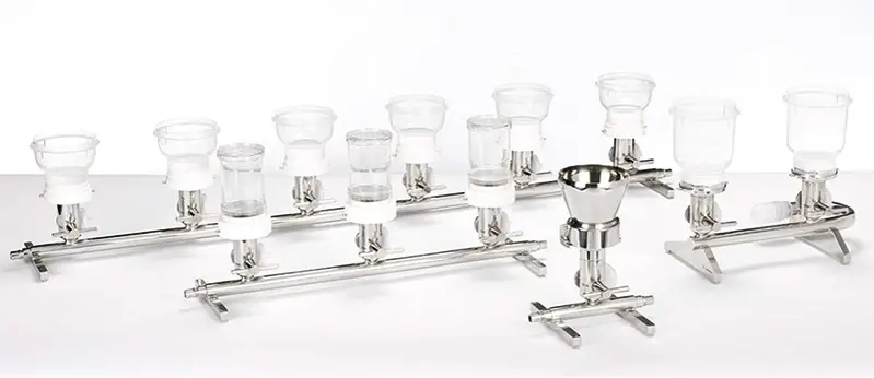 • Livrée avec entonnoirs 100 ou 500 ml (couvercle et joint), support pour filtre de 47 et 50 mm (fritté et joint), bouchons et tuyau en silicone avec raccord rapide (20 cm)